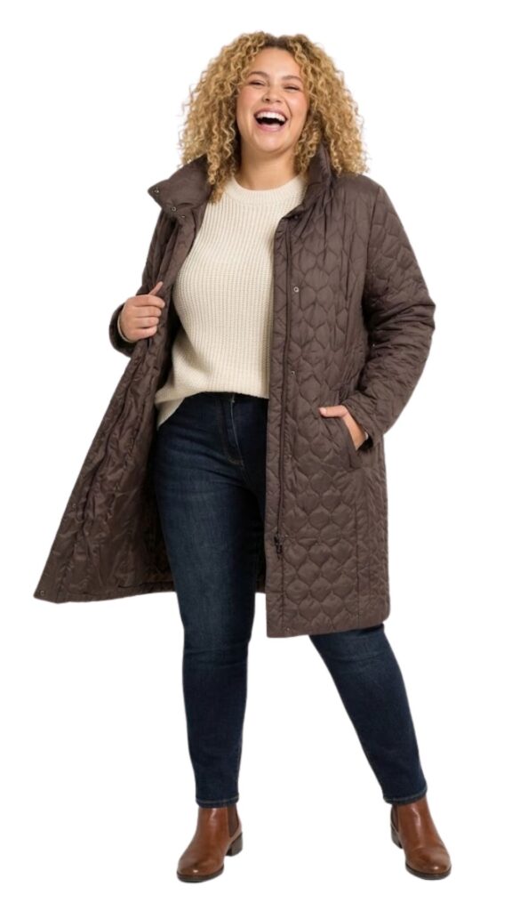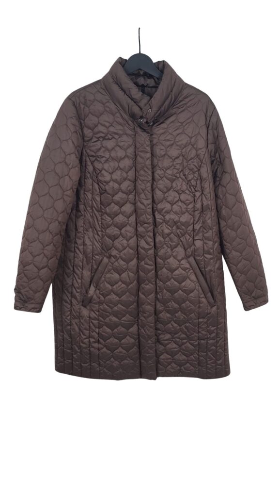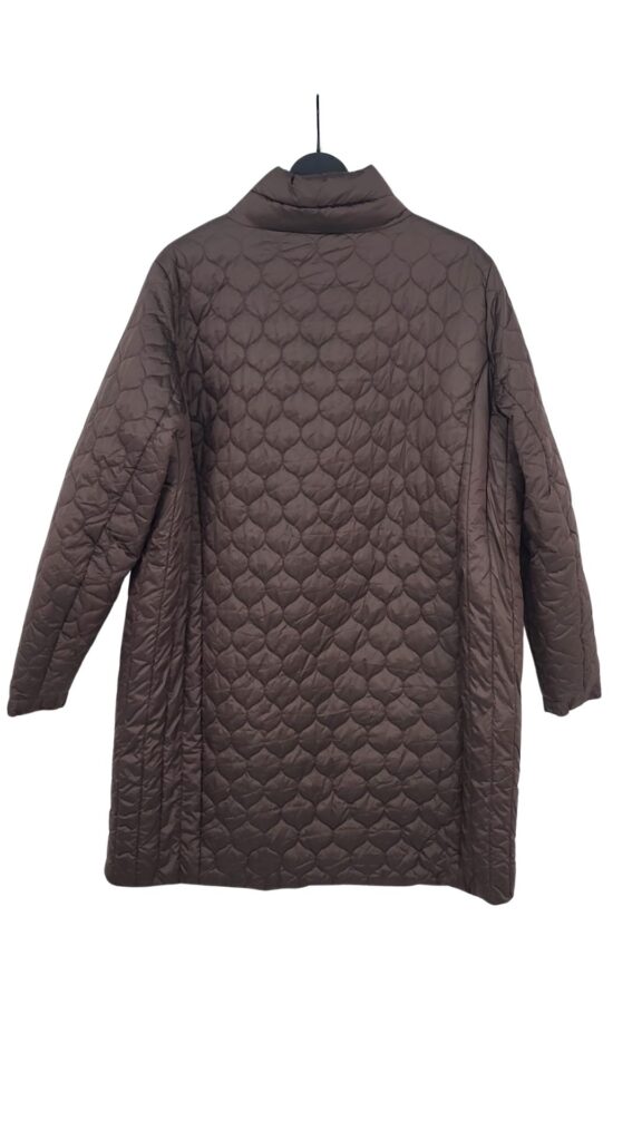 Abrigo de invierno de la marca B. (A Feeling of Winter). Color marrón chocolate con diseño acolchado elegante. Relleno térmico vegano «No Downs, Happy Ducks». Cuello alto y cierre doble. Talla Grande. Talla 48/4XL (Etiqueta D46/UK20). ¡Calidez premium y moda ética!