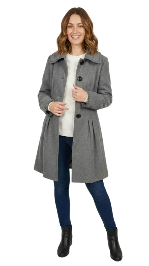 Acabados Dulces: Los pequeños volantes que bordean el cuello camisero y los puños aportan un toque coqueto y diferenciador, alejándolo de los abrigos grises básicos.