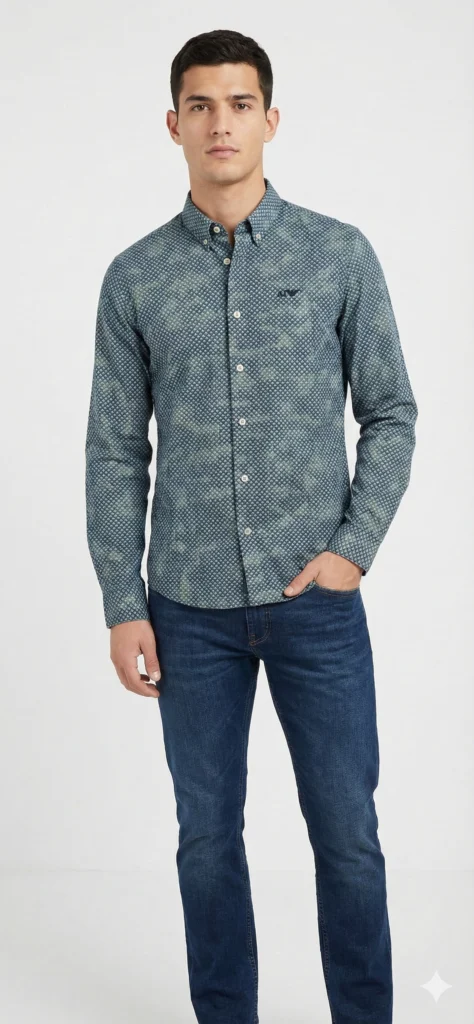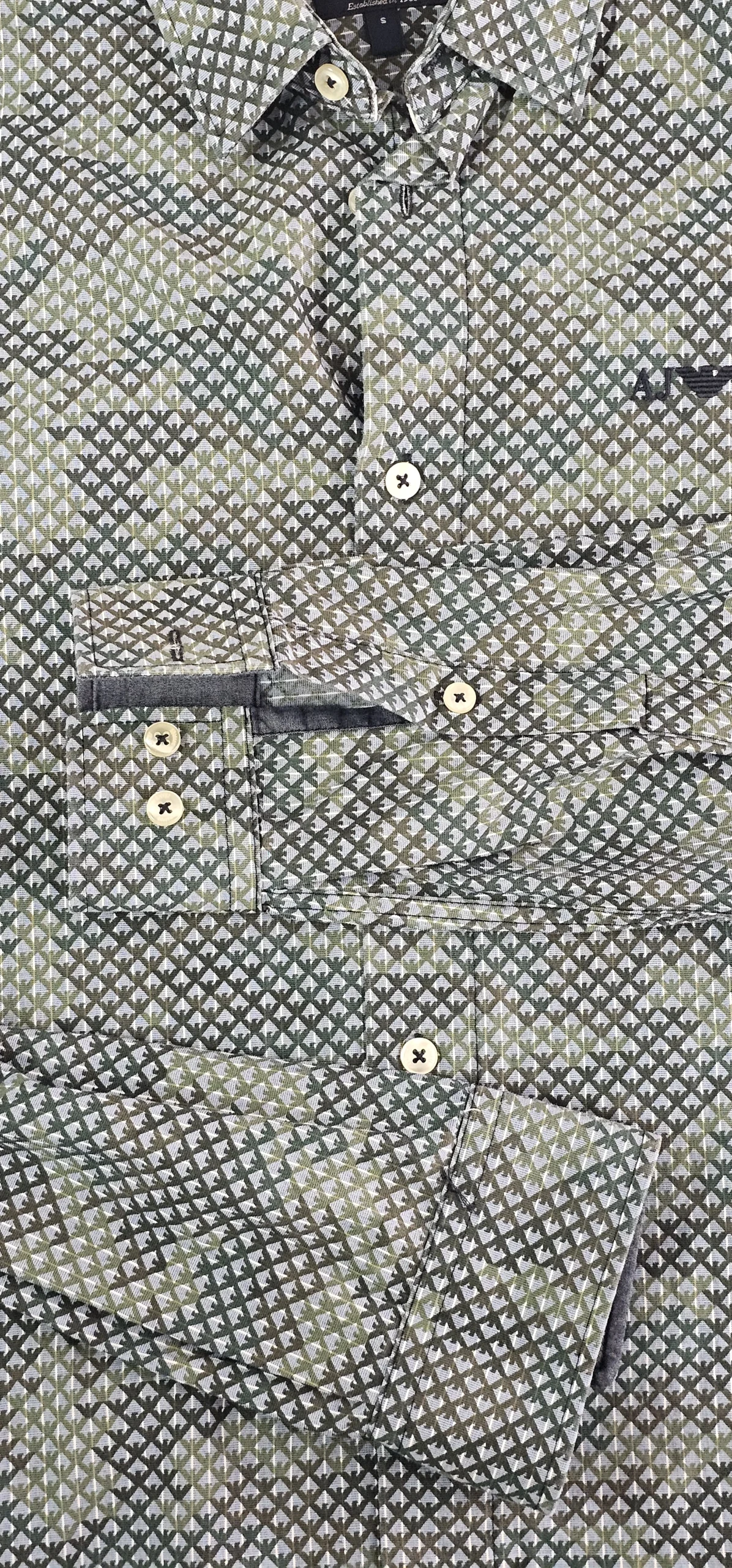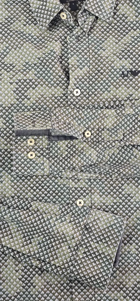Detalles que marcan la diferencia Confeccionada con un tejido de alta calidad, esta camisa destaca por su microestampado geométrico único, que fusiona tonos verdes oliva, grises y azules creando una textura visual rica y moderna.