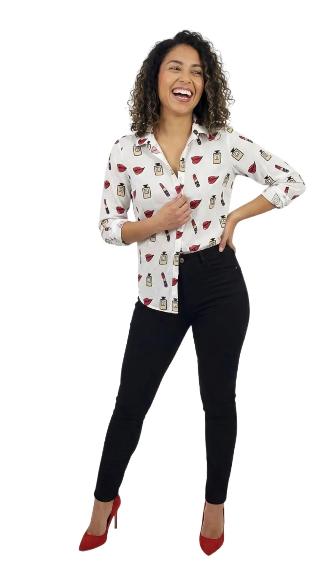 Estampado Novelty: El diseño salpicado de labios rojos, pintalabios y frascos de perfume sobre fondo blanco crea un contraste vibrante y alegre, muy estilo Pop Art.