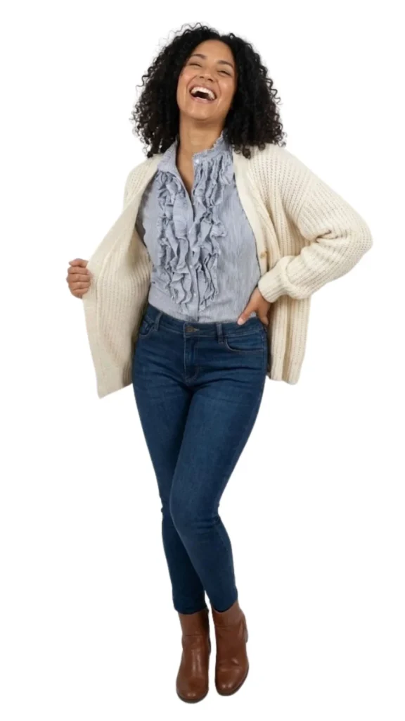 Combínalo Es ideal para llevar por dentro de un pantalón de pinzas azul marino o beige para el trabajo. Para un look más casual (como la modelo), úsala con vaqueros y un cárdigan de punto grueso abierto.