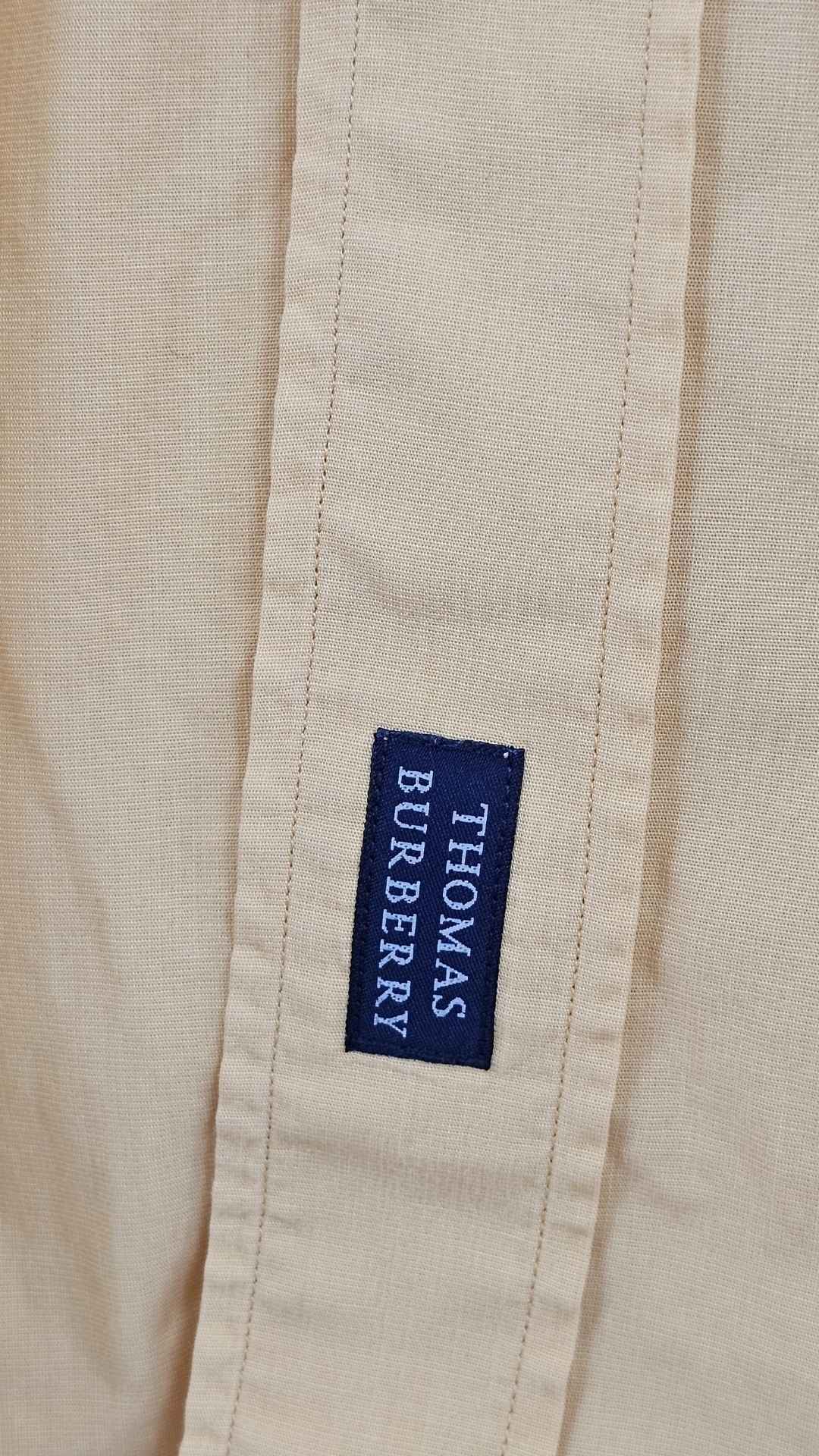 Etiqueta en el bajo: Detalle sutil de marca «Thomas Burberry» en la parte inferior de la botonera.