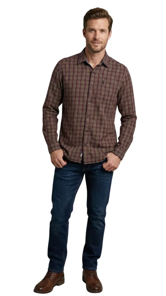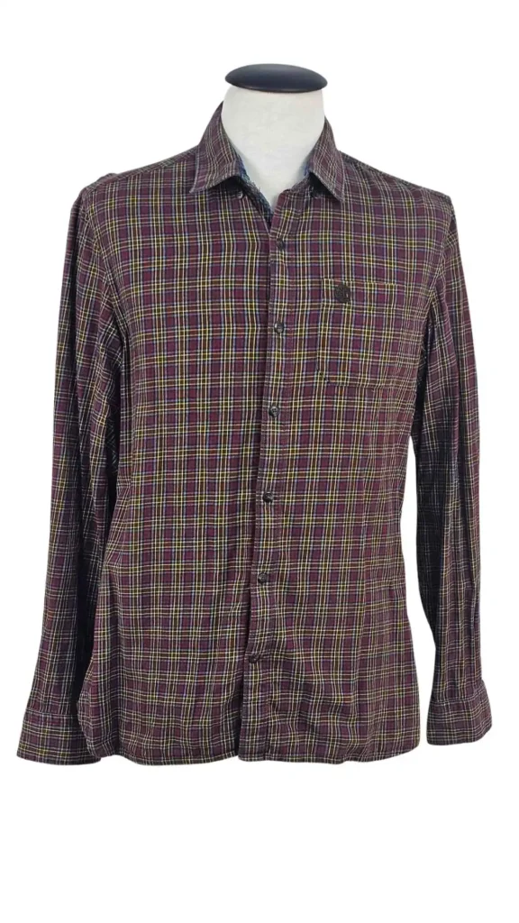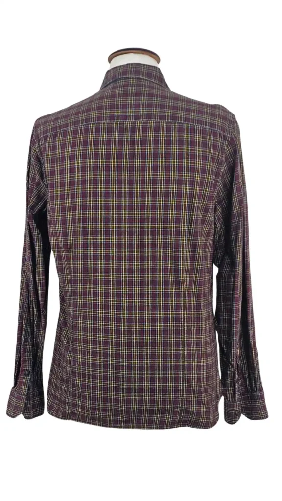El Estampado: Un patrón de cuadros (plaid) rico en matices, mezclando tonos burdeos, gris azulado y líneas de contraste en amarillo vivo.