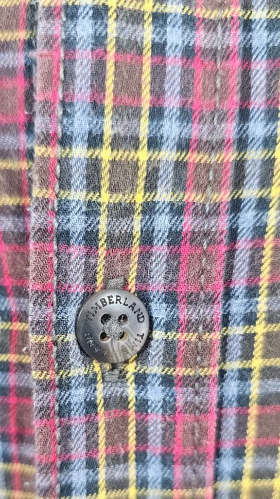 Acabados: Botones oscuros grabados con la marca «Timberland» y el logotipo del árbol bordado a tono en el bolsillo del pecho, símbolo de calidad y respeto por la naturaleza.