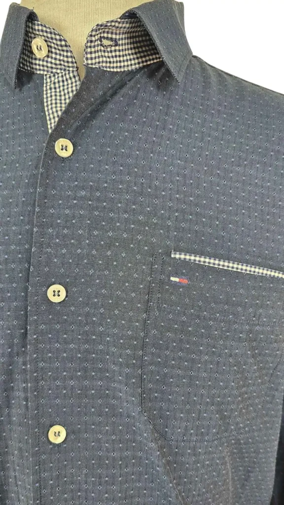 Detalles Exclusivos: Lo que realmente eleva esta camisa es el contraste: el interior del cuello y el borde del bolsillo lucen un tejido de cuadros vichy (gingham), un guiño preppy característico de la marca.