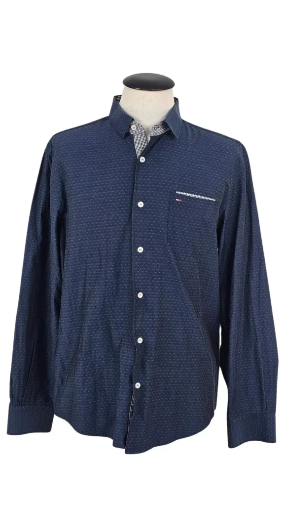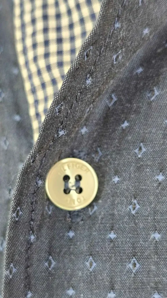 Acabados: Botones nacarados con el grabado «Hilfiger» y costuras en hilo azul a tono. Incluye el icónico logo de la bandera bordado en el pecho.