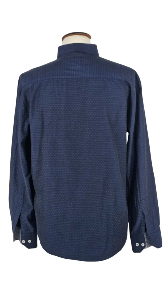 Tejido: Presenta un fondo azul marino profundo realzado por un microestampado de puntos (tipo dobby) en tono más claro, aportando una textura visual rica y sofisticada.