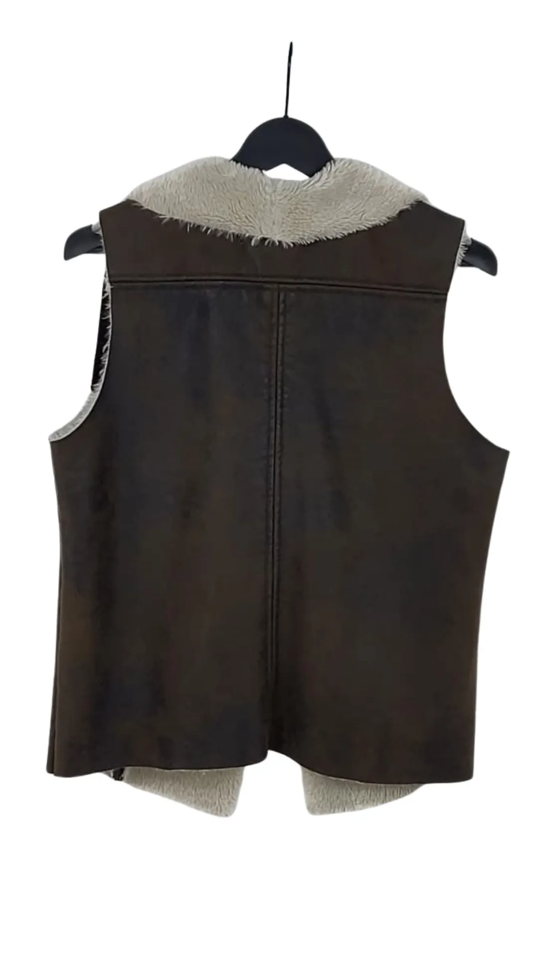Protégete del frío con estilo gracias a este chaleco de H&M (L.O.G.G.). Una prenda que combina la estética vintage del cuero envejecido con la suavidad del borreguito, ideal para crear looks a capas con mucha personalidad.
