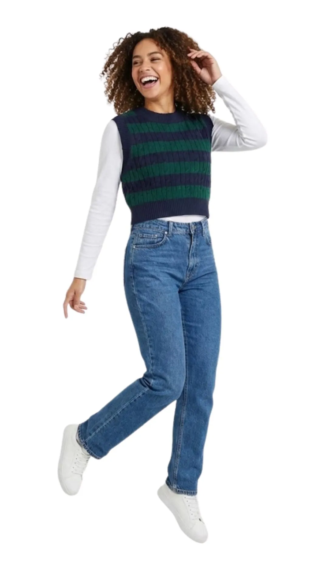 Combínalo El look de manual es sobre una camisa blanca o camiseta de manga larga blanca y jeans rectos (como la modelo). También queda muy bien solo como top en entretiempo.