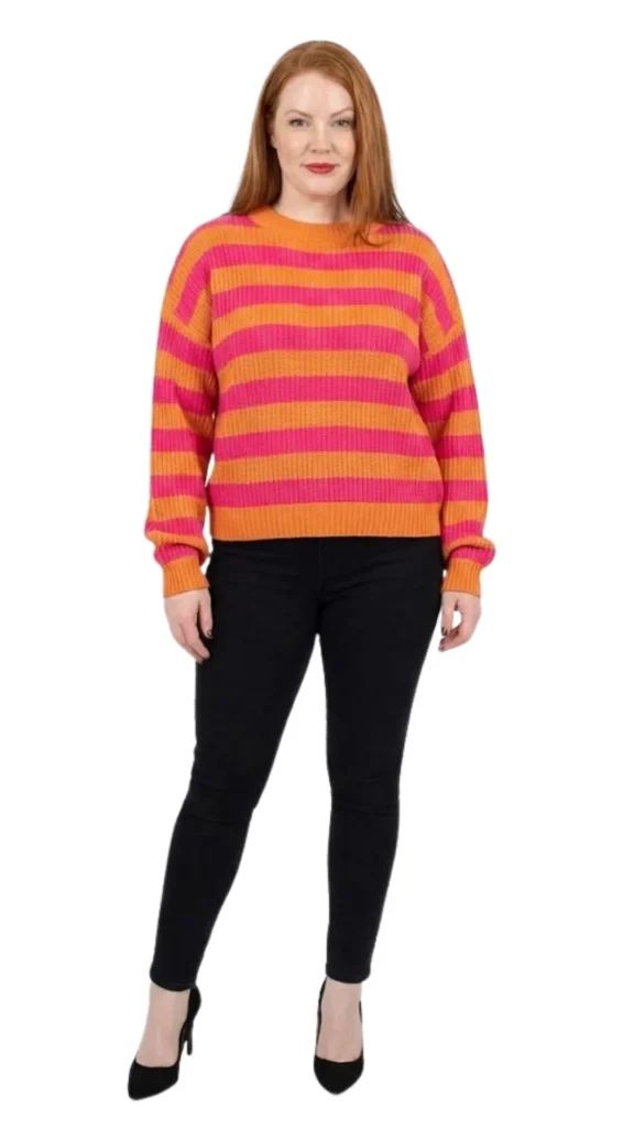 Jersey de punto vibrante de Selección Reusa. Diseño de rayas anchas en contraste rosa fucsia y naranja. Tejido con textura acanalada suave. Corte cómodo de hombros caídos y mangas con volumen. Talla L. ¡La combinación de colores tendencia para iluminar tu look!