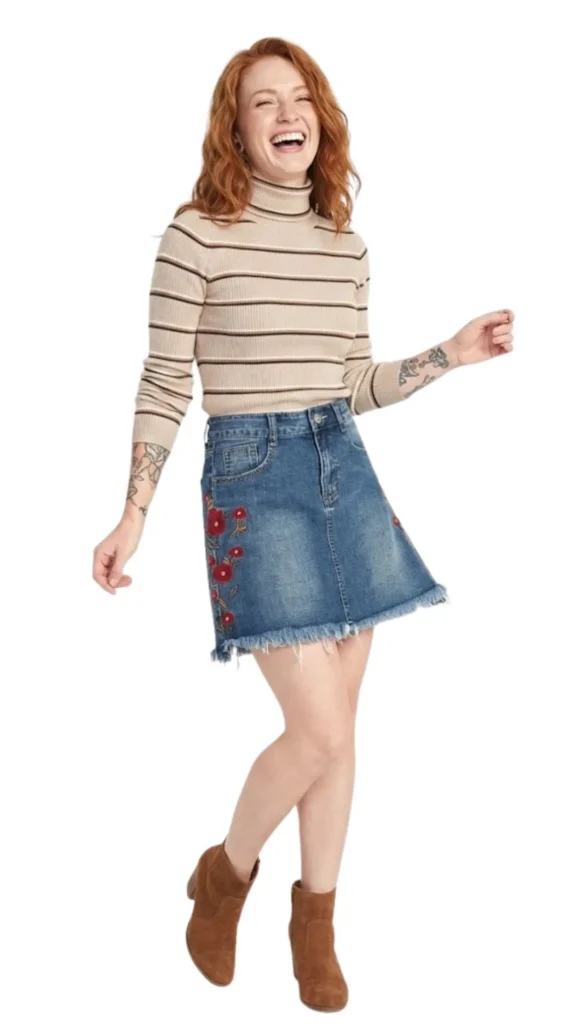 Combínalo Para un look de transición, úsala con un jersey de cuello alto en tonos tierra o rayas (como la modelo) y botines. En verano, queda ideal con una camiseta blanca básica y sandalias.