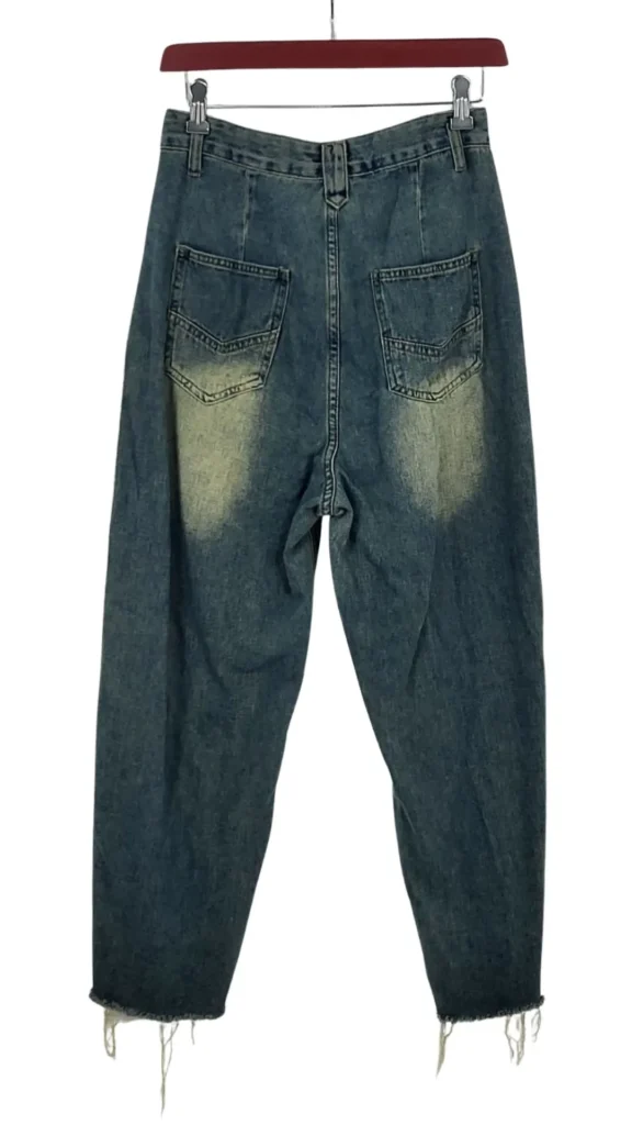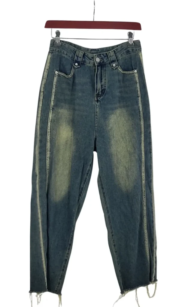 Acabados: Bolsillos traseros con costuras de diseño y bajos con corte al vivo (raw hem/frayed) que aportan rebeldía.