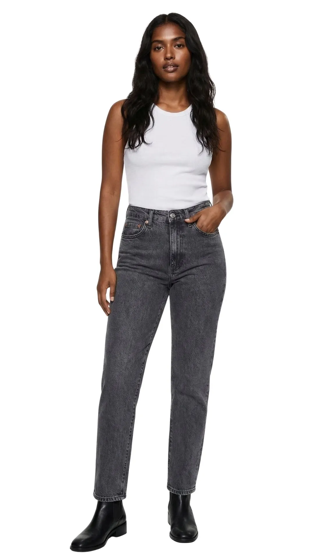 El Corte: Silueta de tiro alto que marca la cintura y pierna recta (Straight Leg), ofreciendo comodidad sin ser anchos. Es un corte que estiliza y nunca pasa de moda.