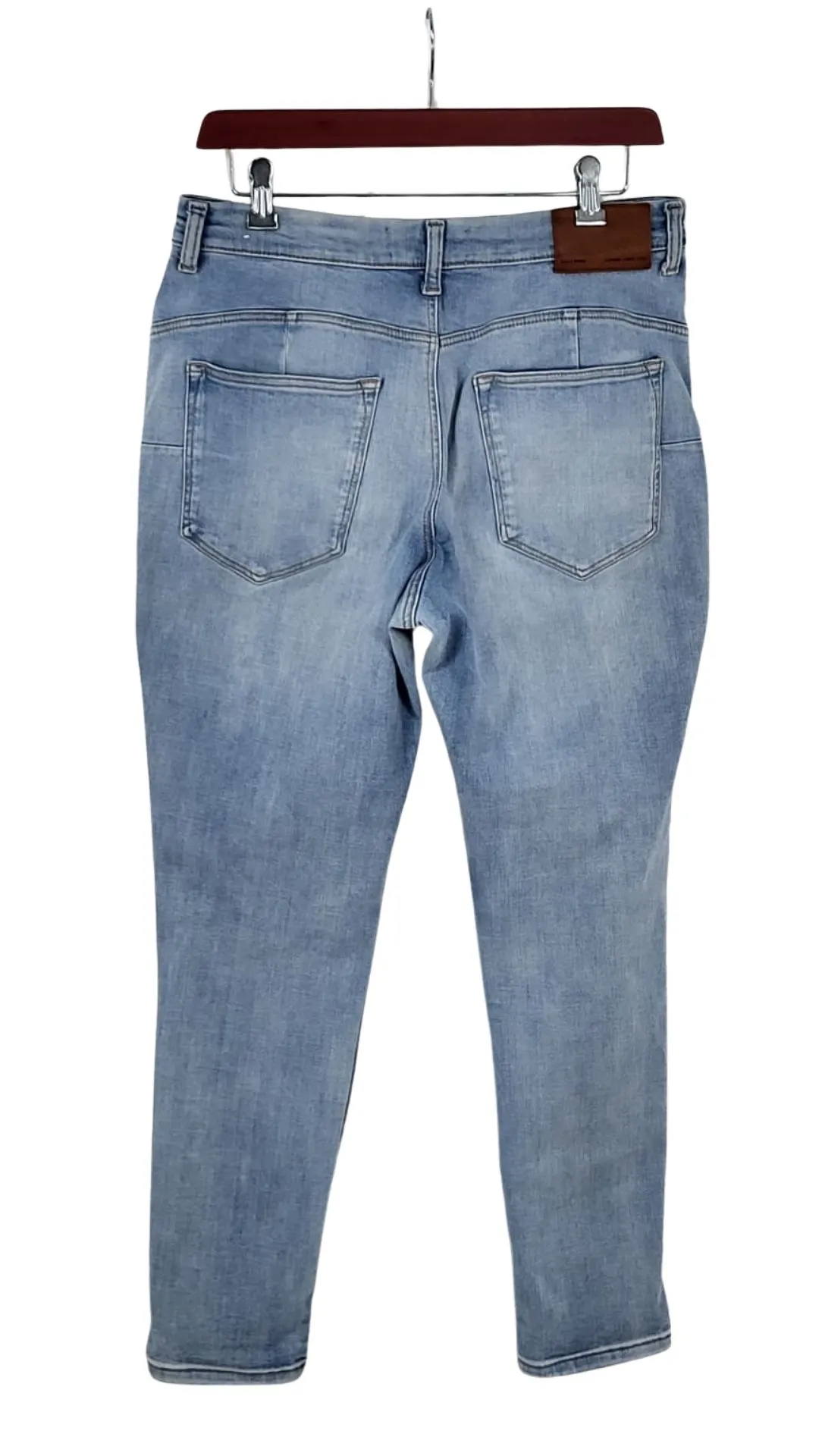 Acabado: Un lavado azul luminoso con desgastados sutiles en los muslos que aportan un aire fresco y casual.