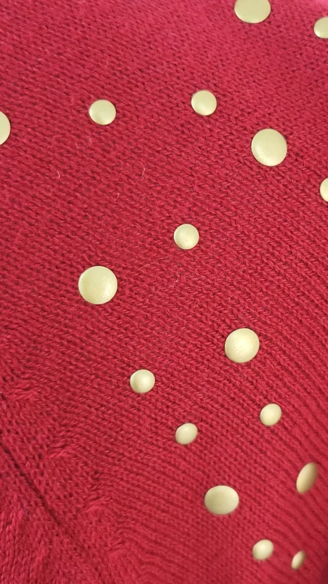 Estilo «Chic»: Lo que hace especial a esta prenda es la lluvia de pequeñas tachuelas metálicas (en tono oro viejo/bronce) que adornan ambos hombros, creando un efecto de luz sutil y elegante.