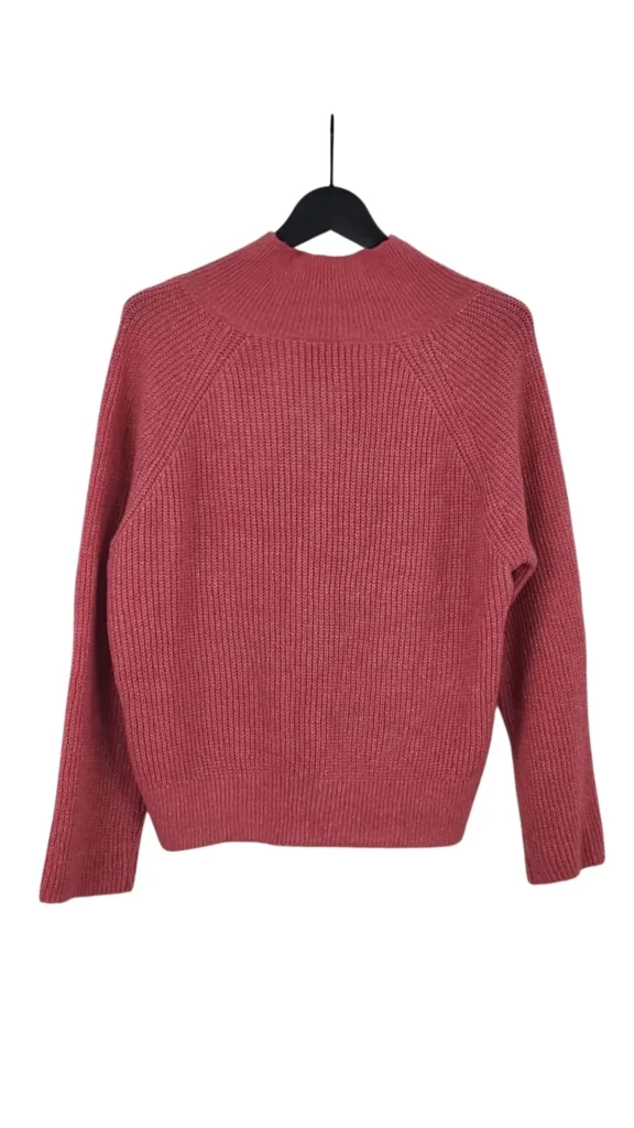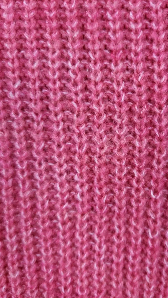 Textura Rica: Confeccionado en un punto con estructura de canalé inglés (chunky knit) que es tendencia total. El hilo mezcla tonos rosa fresa y blanco (efecto jaspeado), creando un color coral vibrante pero suave.