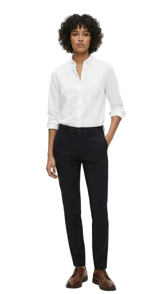 Combínalo Llévalo con una camisa blanca y mocasines para el look de oficina definitivo [SKU032-MODELO.png], o con una camiseta de rayas y zapatillas para un estilo parisino relajado.