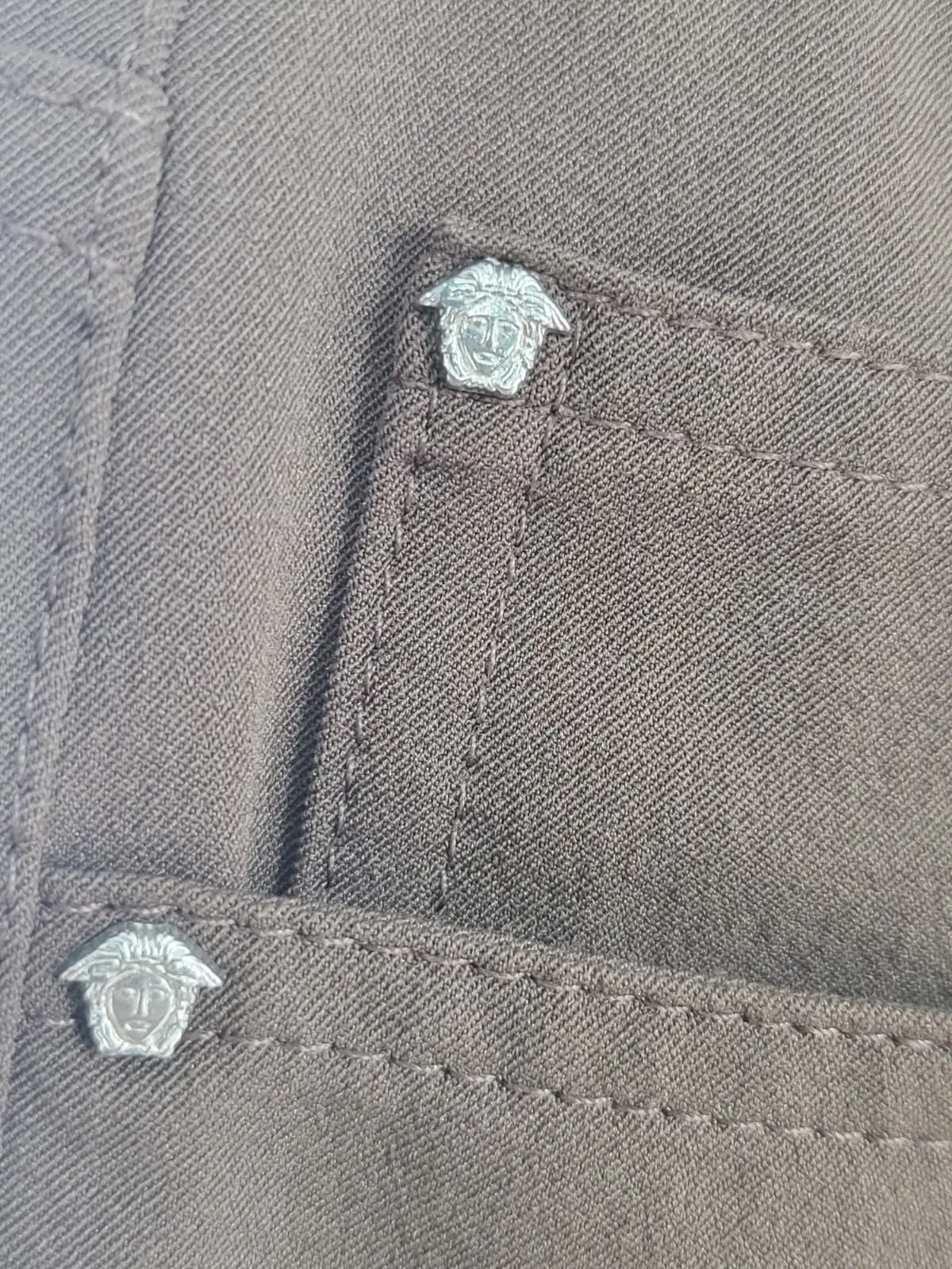 Iconografía Versace: Cada detalle cuenta: el botón principal y los remaches de los bolsillos llevan grabada la icónica cabeza de Medusa en plateado, aportando ese toque de opulencia discreta.
