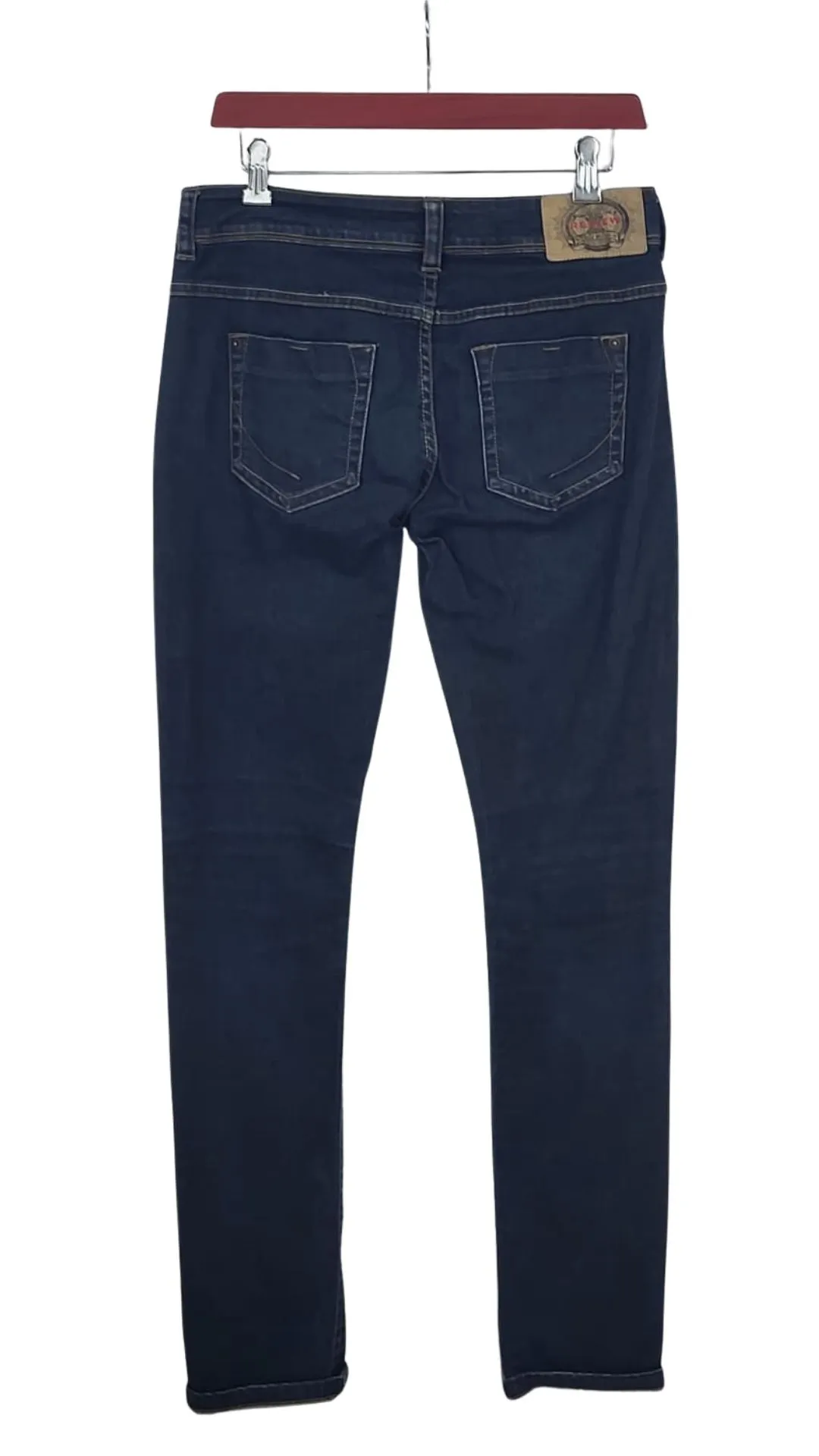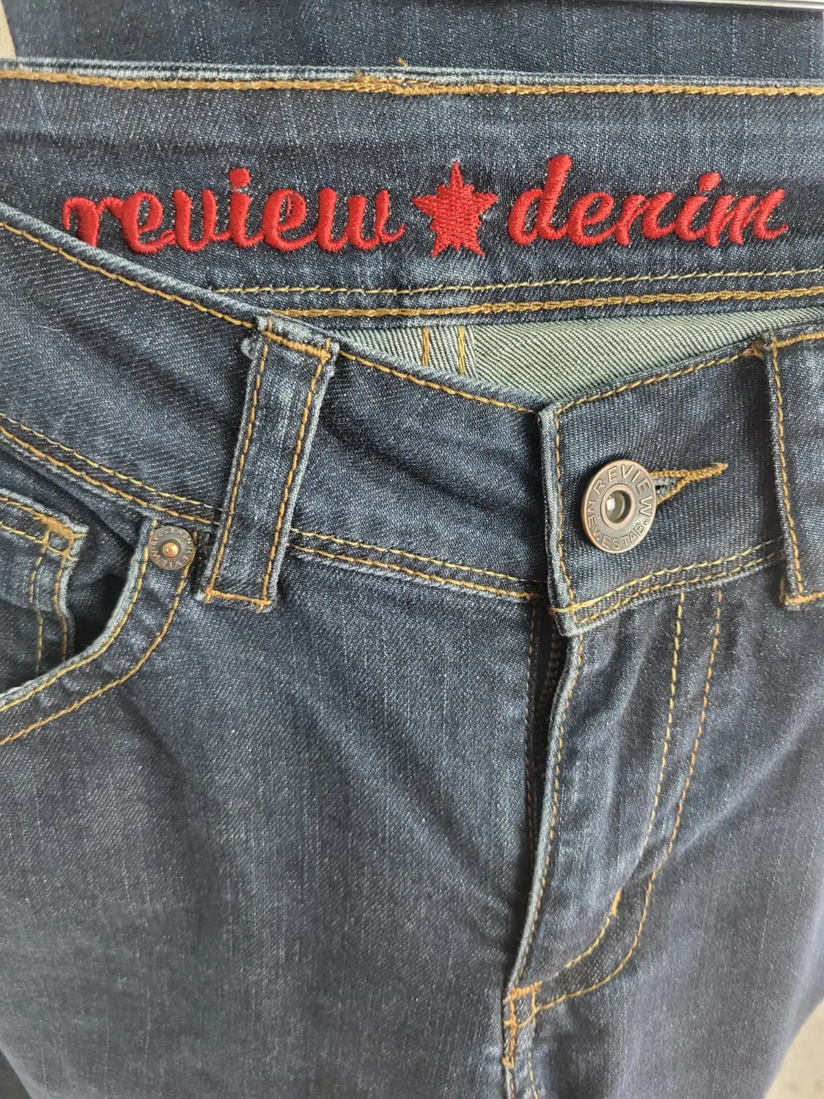 Calidad Review: Destacan los acabados cuidados, como el bordado interior «review denim» en rojo y el parche de la marca en la cintura trasera.