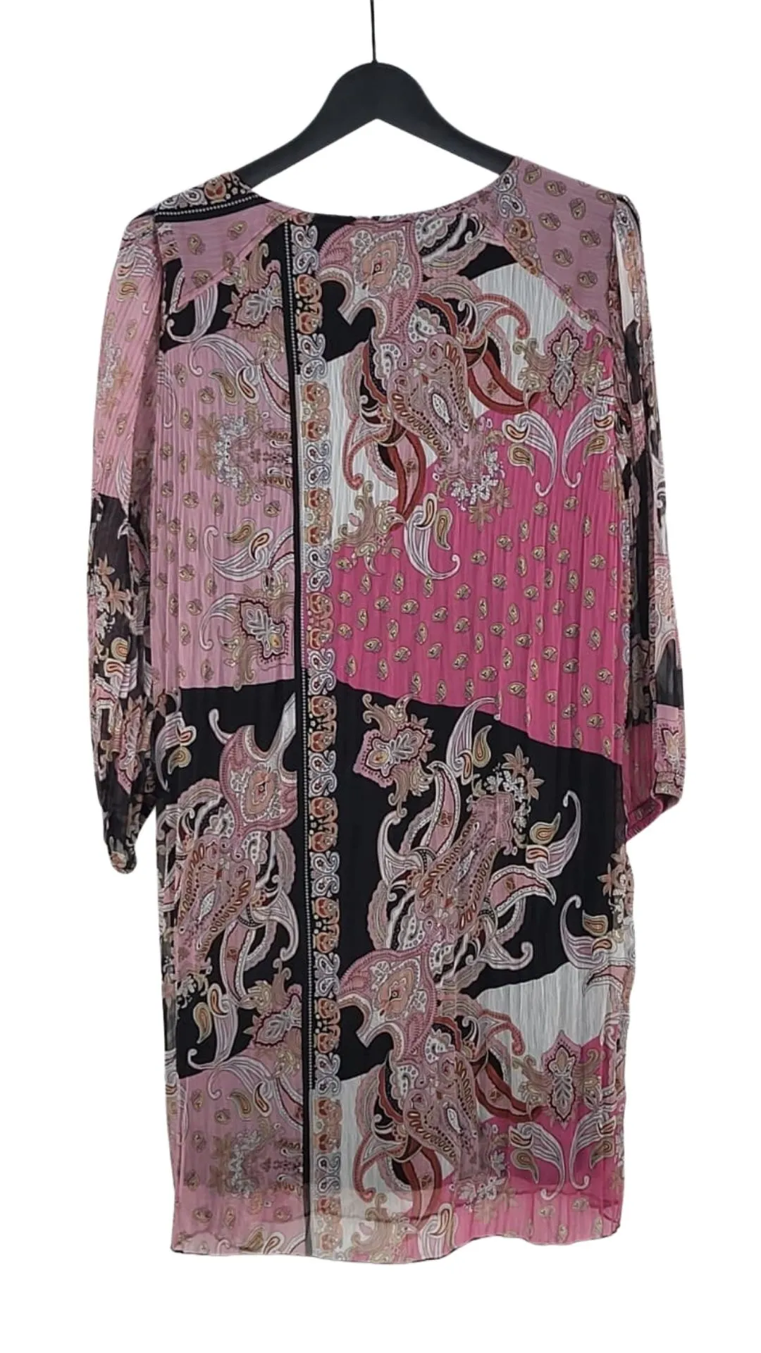 Estampado Boho-Luxe: La mezcla de patrones paisley y florales en bloques de color (rosa, negro y crema) crea un efecto visual rico y artístico, típico del diseño escandinavo.