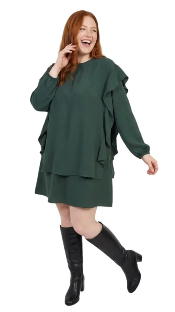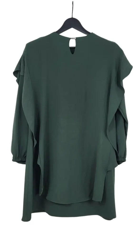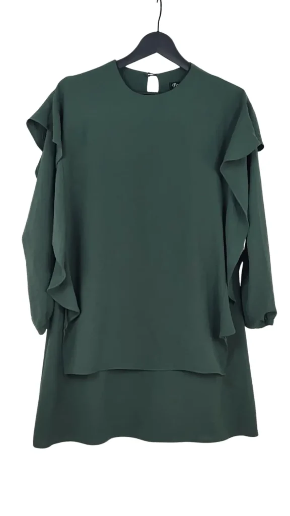 Añade un toque de sofisticación desenfadada a tu vestuario con este vestido de Perçem. Su profundo color verde bosque y su diseño arquitectónico con volantes lo convierten en una pieza especial, perfecta para salir de la rutina del negro.